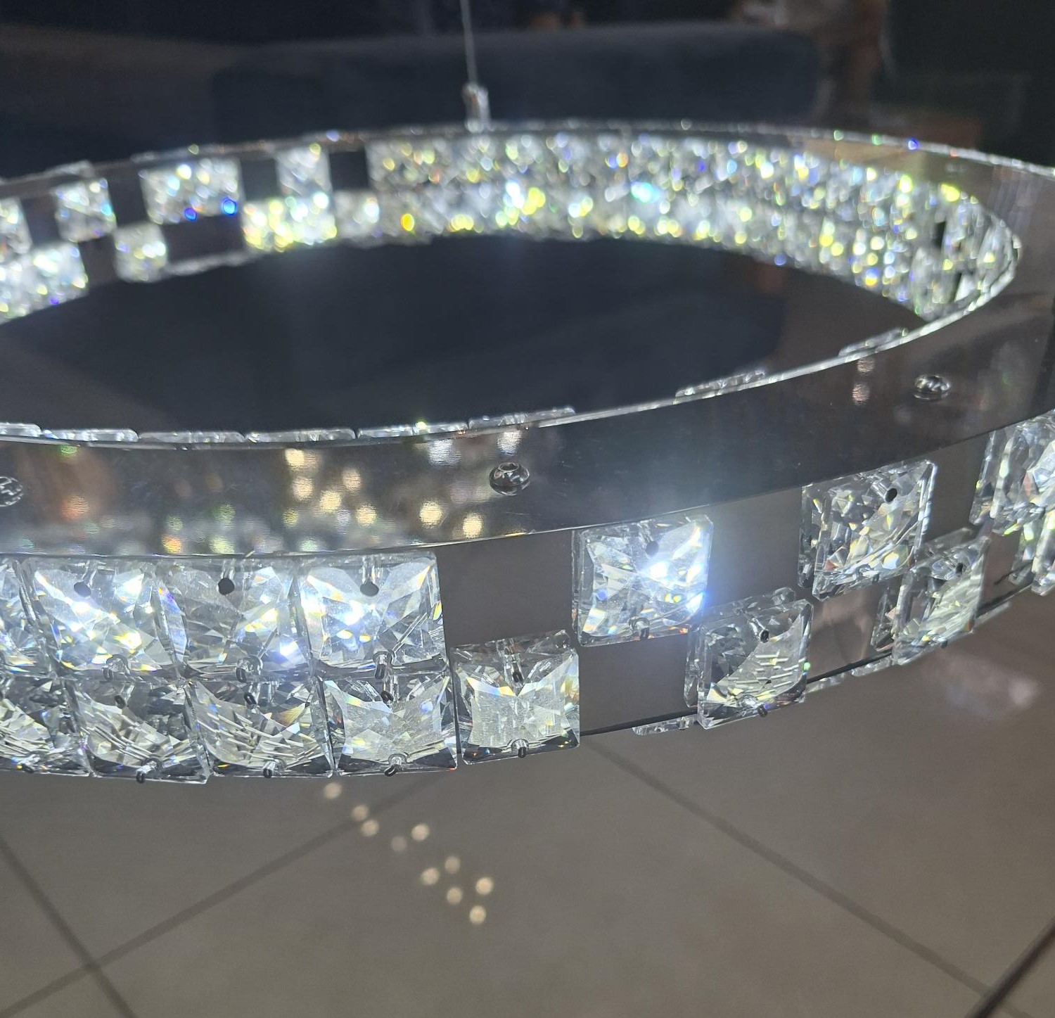 Crafted in a polished chrome finish, each ring is integrated with high-output LED lighting, producing a powerful 468W illumination system. The light colour is fully switchable between Cool White and Warm White, allowing you to customise the atmosphere to suit the space — from crisp contemporary brightness to a warm, inviting glow.