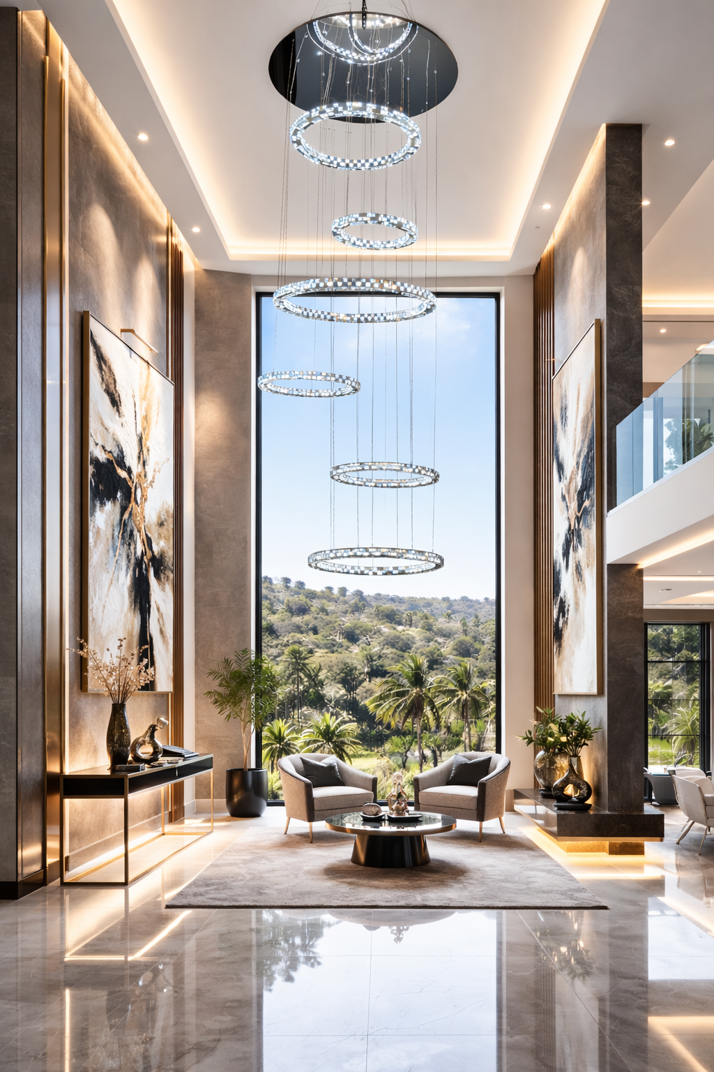 With a fully adjustable drop length of up to 3000mm, this chandelier is engineered specifically for grand staircases, double-height entrance halls, and high ceiling living areas. The varying ring sizes (900mm, 700mm ×3, 500mm ×2) create depth and architectural layering, ensuring dramatic visual impact from every viewing angle.