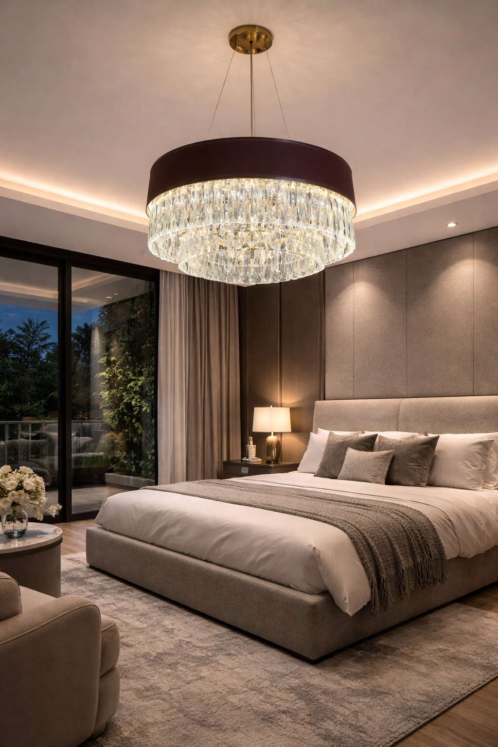 The premium leather outer shade introduces warmth and a designer finish. Meanwhile, the crystal detailing captures and reflects light beautifully, enhancing the room’s atmosphere. Inside the fixture, an integrated LED strip provides smooth, energy-efficient illumination, so the space feels bright yet comfortably ambient.