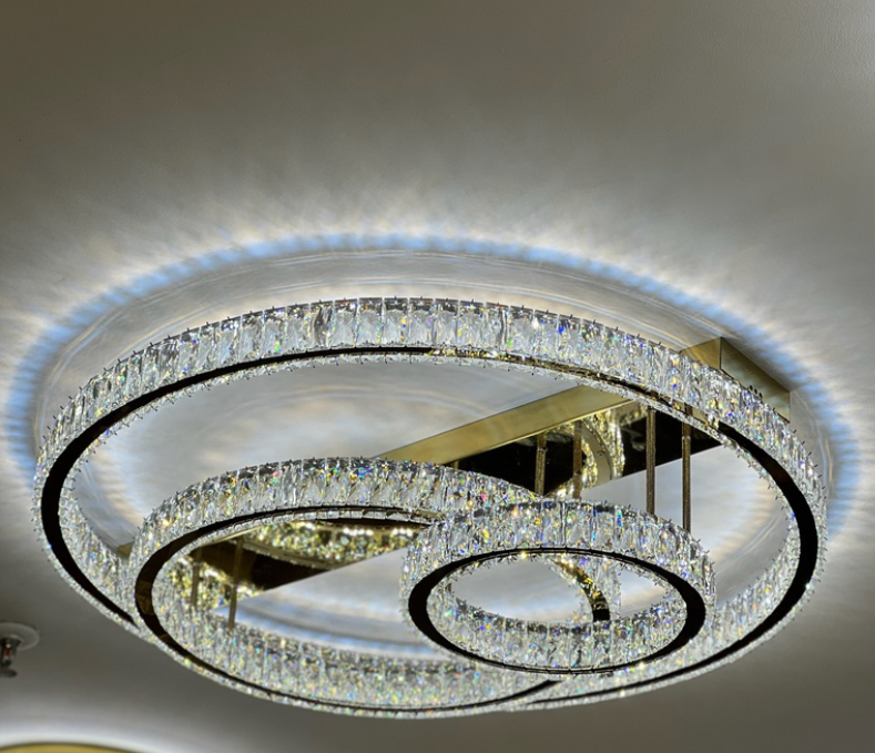 The modern overlapping ring LED chandelier combines architectural elegance with powerful, adjustable illumination, making it ideal for contemporary interiors. Featuring overlapping rings in a crystal and metal design, this chandelier creates visual depth while maintaining a clean, modern aesthetic. Meanwhile, integrated high-output LEDs provide selectable warm white or cool white lighting, allowing you to adjust the ambience for living rooms, dining areas, bedrooms, or luxury commercial spaces. As a result, this fixture offers both functional light and sculptural beauty, perfect for standard ceiling heights.
