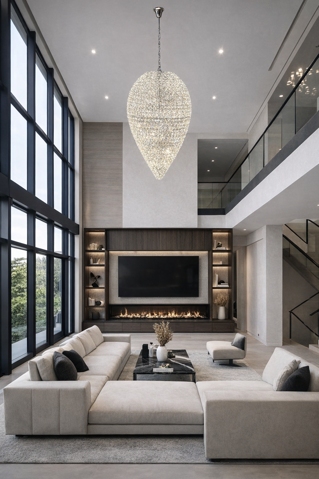Available in two sizes, the teardrop crystal chandelier works beautifully in staircases, entrance halls, dining areas, living rooms, and hotel lobbies where a dramatic lighting focal point is desired. Whether installed in residential interiors or luxury commercial spaces, it creates a refined atmosphere of brilliance and architectural sophistication.